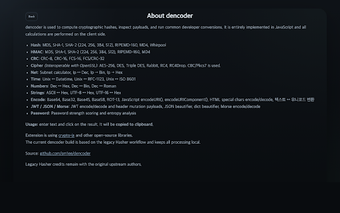 dencoder 是一个多功能的 Chrome 扩展,旨在为需要一套转换和检查工具的开发者提供服务,直接在他们的浏览器中使用。这个免费的工具采用本地优先的方法,确保所有处理都在扩展内进行,从而提高效率和安全性。主要功能包括对各种哈希算法、HMAC、CRC 的支持,以及文本的编码/解码选项,还有用于检查 JWT 和格式化 JSON 的工具。此外,dencoder 还提供摩尔斯电码转换、IP 和子网分析以及时间和数字转换的实用工具,使其成为开发者的全面工具箱。